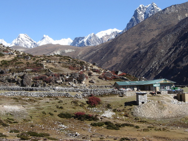 We descend downhill through a forest, cross the ImjaKhola and climb steadily to the village of Pangboche. This village is directly opposite AmaDablam [6,856 m], and has exceptional views of the mountain, with the gompa, mani walls and scattered pine trees in the foreground. A further two hours walk brings us to Pheriche..