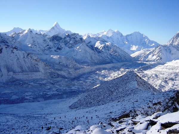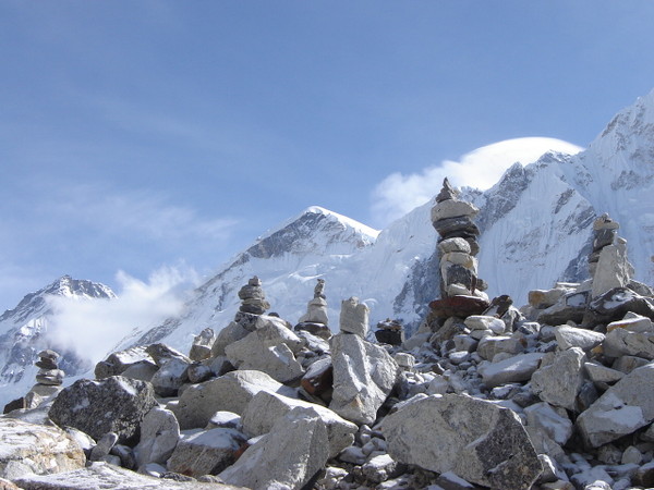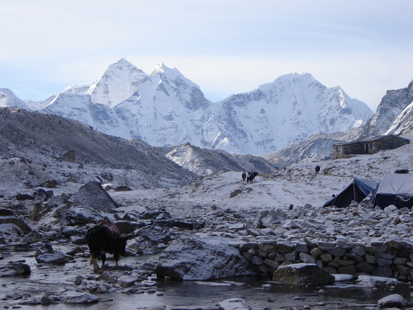 We continue up the wide valley beneath the impressive peaks of Cholatse and Tawache on the left. We then turn right and take a steep climb towards the foot of the Khumbu Glacier. The tea house at Duglha is a good spot to have lunch. The trail zigzags up through the boulders of the glacier's terminal moraine. At the top of this climb there are many stone cairns, built as memorials to the many Sherpas who have died while climbing Mt Everest. The path then climbs gently along the glacier, to eventually reach the cluster of houses at Lobuche. .